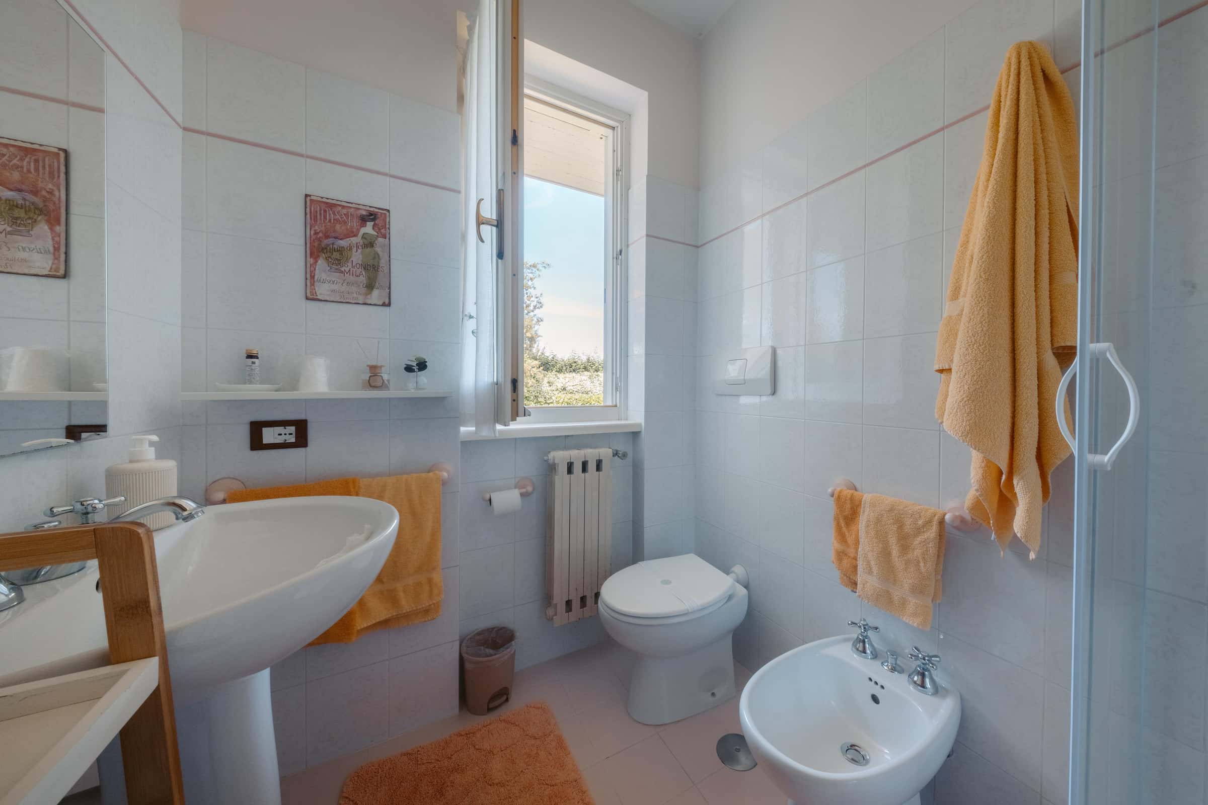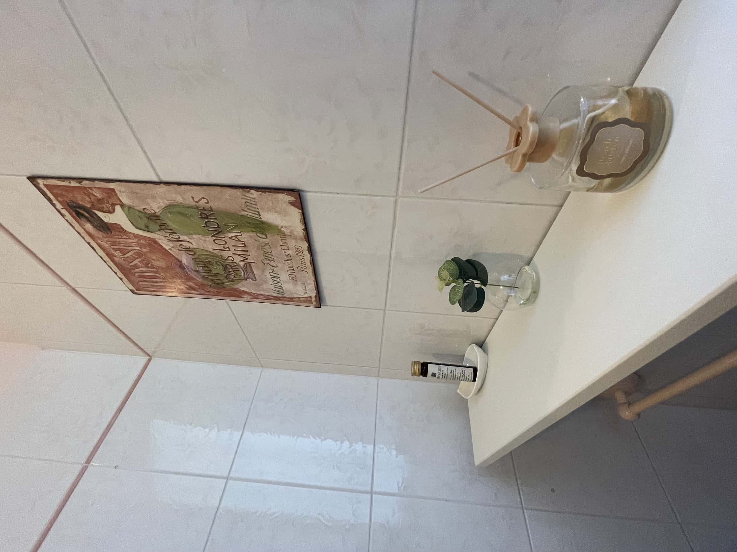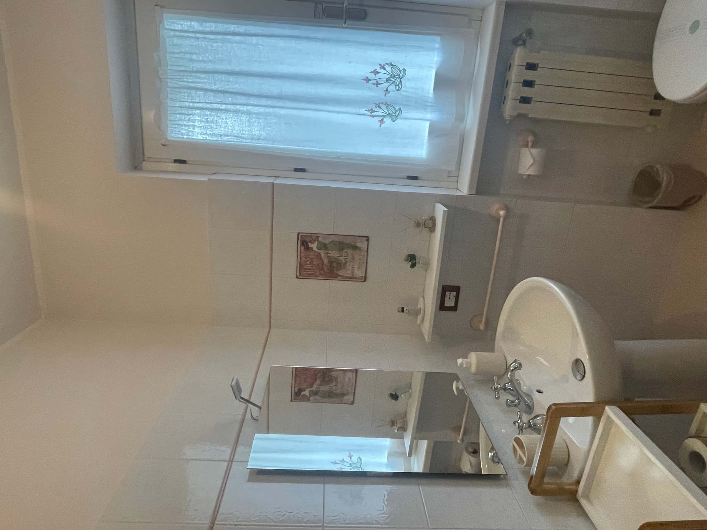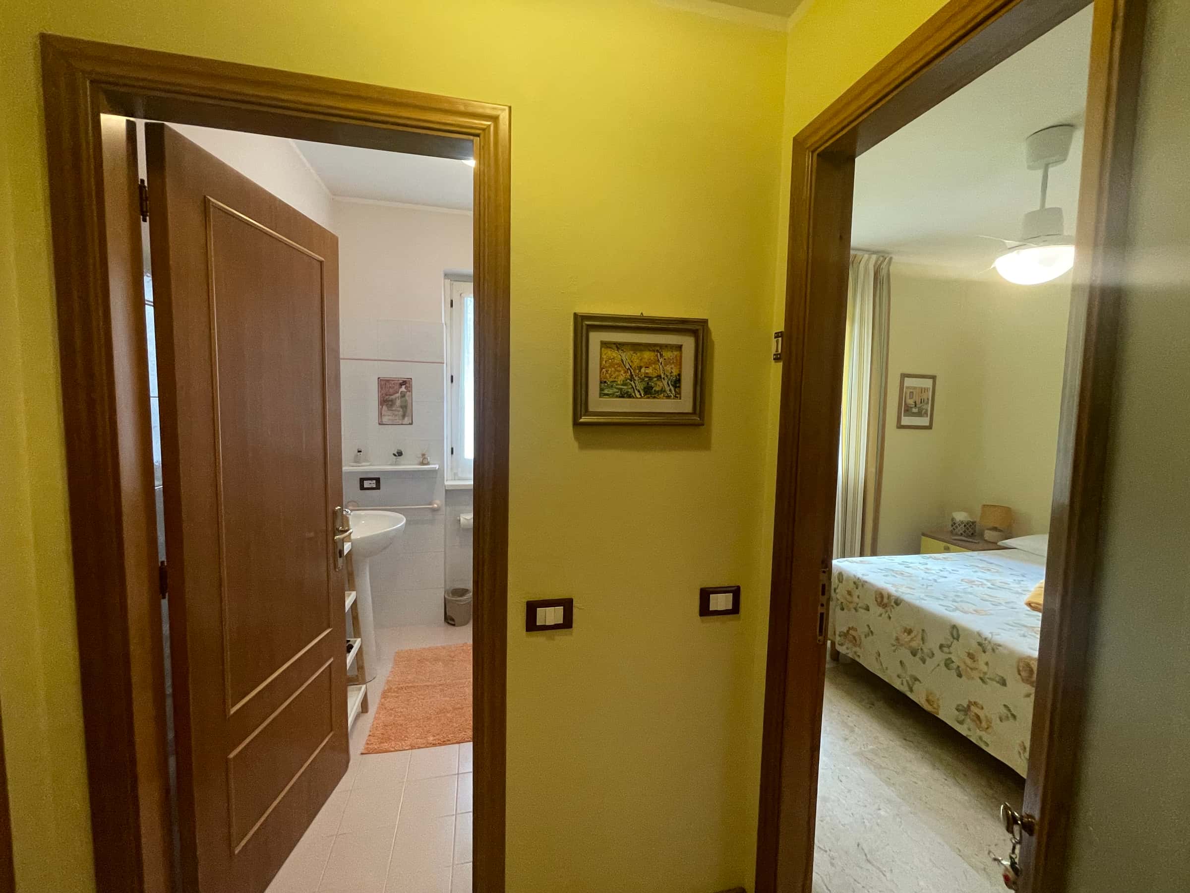 The bathroom is shared only with the owner, who uses a separate small room as an office and is present very little during the day. Shared areas include a spacious living room, fully equipped kitchen, and a livable terrace, where an outdoor lounge is being set up – perfect for aperitivo at sunset or a relaxing break in the fresh air.